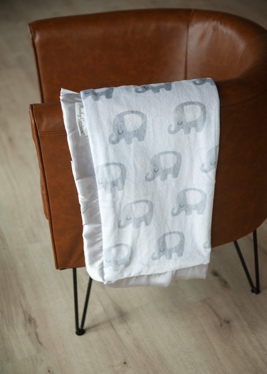 - Details: Snuggle up in style with this cozy blanket featuring adorable silver elephants on a soft white background. Perfect for adding a touch of whimsy and comfort to any space!ÿThis blanket is backed with aÿsilver plush minky and sewn with a matching silverÿsatin ruffle.