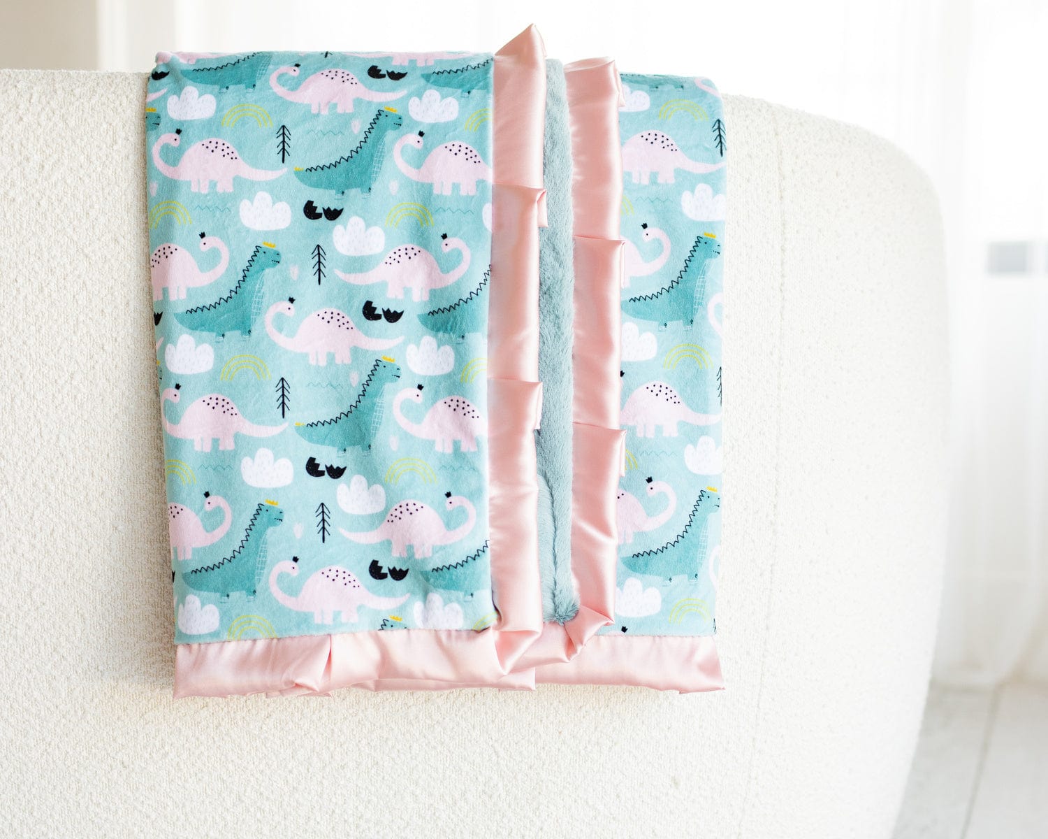 - Details:ÿMs. Dinoÿhas a fun pattern of blue and pink dinosaurs on a light blue background.ÿThisÿblanket is backed in a misty greenÿplush minky and sewn with a light pink satin ruffle.