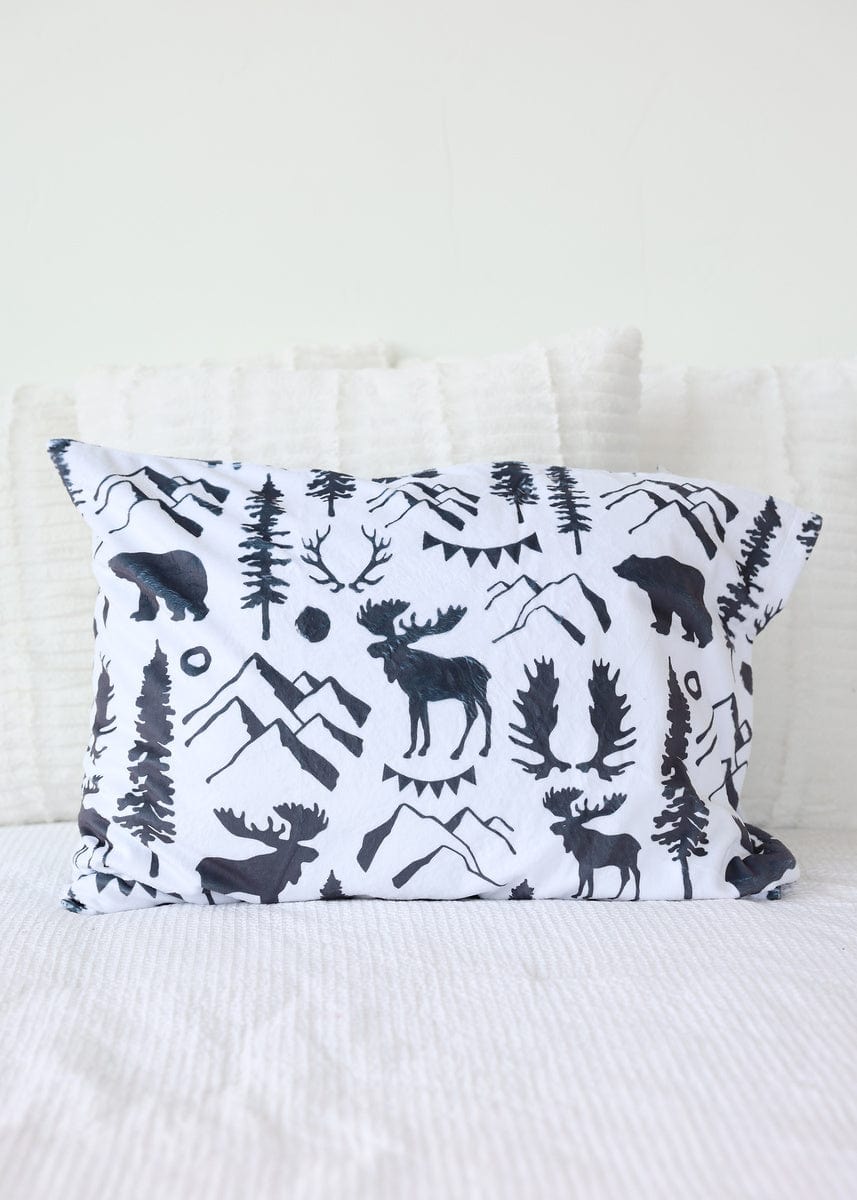 Details:ÿTake a trip to the mountains each time you snuggle up in this blanket full of the outdoors and wildlife including moose, bears and elk! This blanket is backed with a charcoal plush minky fabric and bordered in a matching charcoal satin ribbon.
